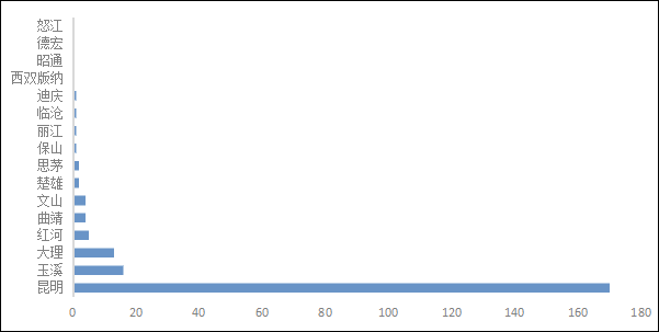 云南省下轄8個(gè)地級(jí)市、8個(gè)自治州,合計(jì)16個(gè)地級(jí)行政區(qū)劃單元,省會(huì)昆明市。本次調(diào)查的云南省環(huán)保企業(yè)數(shù)量的地區(qū)分布如圖6。
